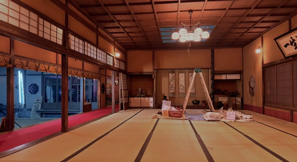 総天井で夜のシーンもある。襲撃が始まる頃には夜になって、大広間の中央には大きな電飾があり、四隅に小さな電灯があります。その光を基本的には利用したかったのですが、主役たちは中央ではなく床の間の方に座っていたので、バランスを取る必要がありました。総天井は格子状になっていて、一枚一枚外せるようになっています。