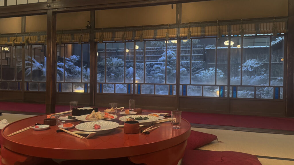昼の時間帯から立花組の新年会が行われていて、外は雪。