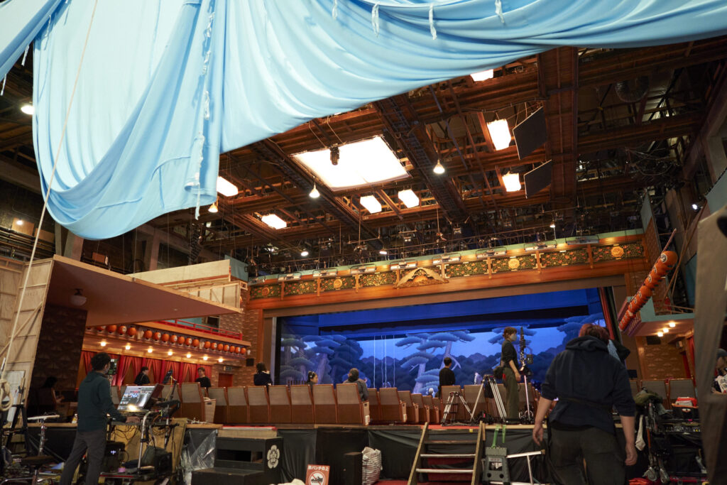 実際の劇場には舞台の上に無数のタングステンライトが何層にも並んでいて、さらに客席側にもびっしりあるんです。あれを東映スタジオに持ち込むには、舞台照明の会社からかき集めて、巨大なユニットを組んで調光を通す必要があって、ものすごい手間と費用と時間がかかるんですね。
