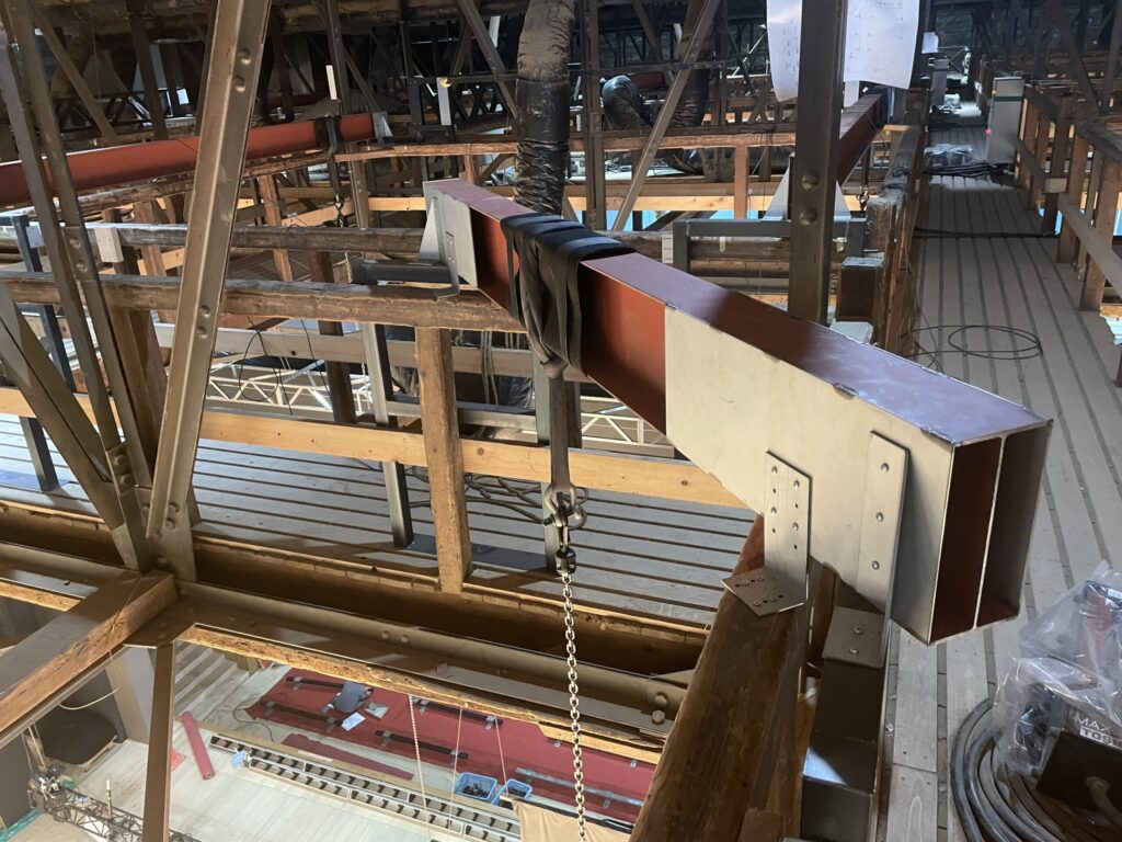 美術部も同じ問題を抱えていました、本来、舞台には何トンもある緞帳(どんちょう)がかかるんですがそれを再現したり、大きな構造物を作るためには強固な骨組みが必要になる、そこで美術部は優秀な鉄骨屋さんと組んで耐荷重がクリアできるような強い鉄骨のアングルを天井足場に作り、それを支点にして構造物を作る解決法を考えました、それでようやく我々照明部も昇降バトントラスが施行されLEDを本格的に使える環境が整ったのです。美術部と鉄職人友井さんに感謝です。