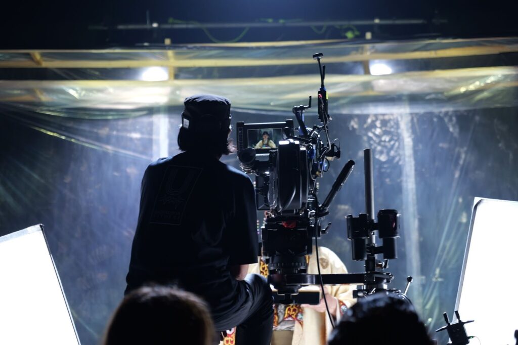 フィルム撮影の現場では、デジタルカメラの現場と違い、ビジコン(ビデオアシスト)を通してモニターに画が映し出されます。