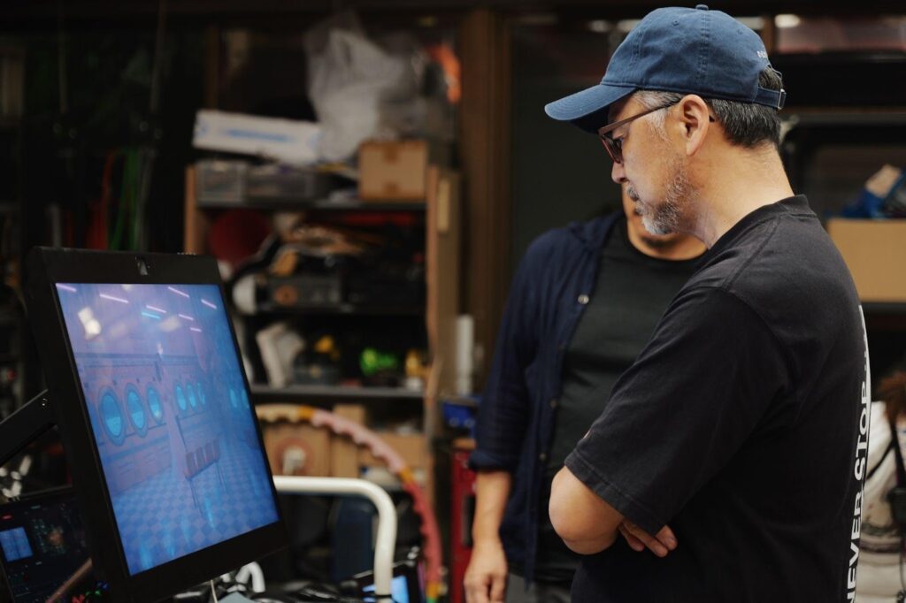 2台のカメラによる立体撮影の映像を現場でリアルタイムに確認・評価できるこの仕組みは、制作のスピードと精度を飛躍的に高めていた。