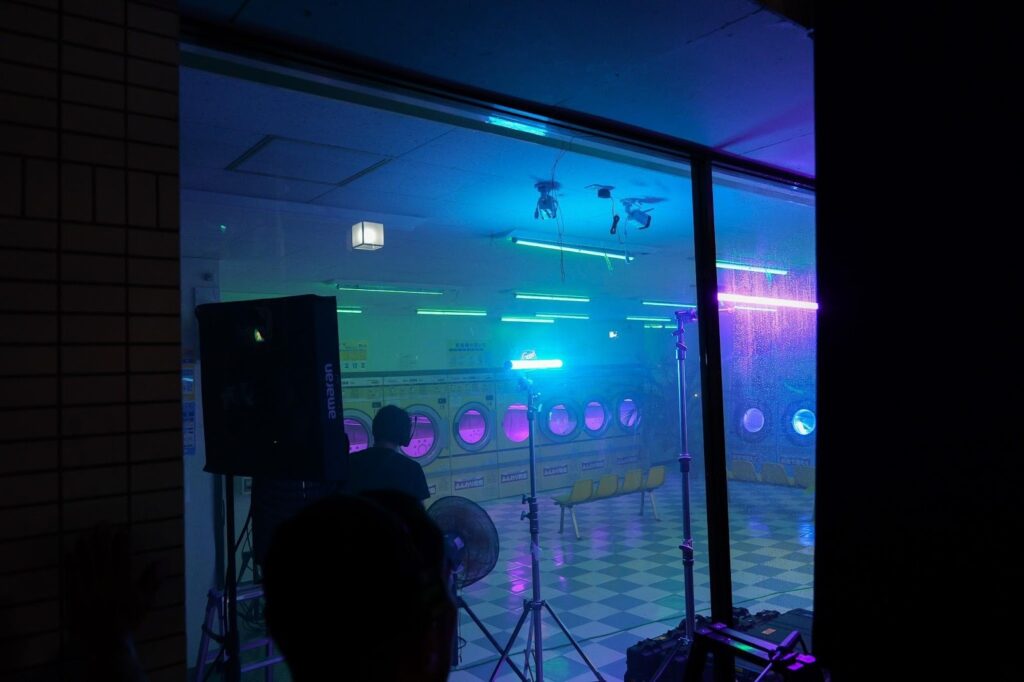 コインランドリーの中にチューブライトを仕込むことで、幻想的な演出を実現