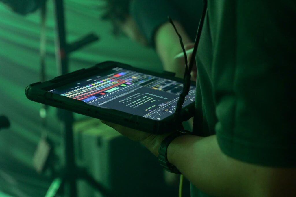 現場によっては卓が置けないこともあるので、iPadでGrandMAを遠隔操作しています。iPadの操作ですと「Blackout Lighting Console」などのアプリもありますが、色々な限界もあるのでGrandMA3を使用しました。海外では一般的ですが、日本ではまだ珍しいスタイルですね。